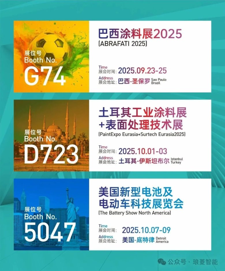 尊敬的客户与合作伙伴:琅菱智能即将开启新一轮全球征程,将于九月至十月连续参加三大国际顶尖行业展会,向全球市场展示我们在智能装备领域的创新成果与解决方案。我们诚挚邀请您莅临展位,共探合作新机遇!01 巴西展会名称:巴西圣保罗涂料展览会展位号:琅菱智能 • 展位G74日期:2025年9月23-25日地点